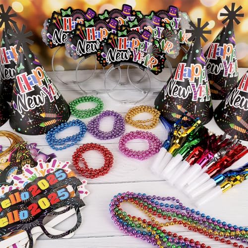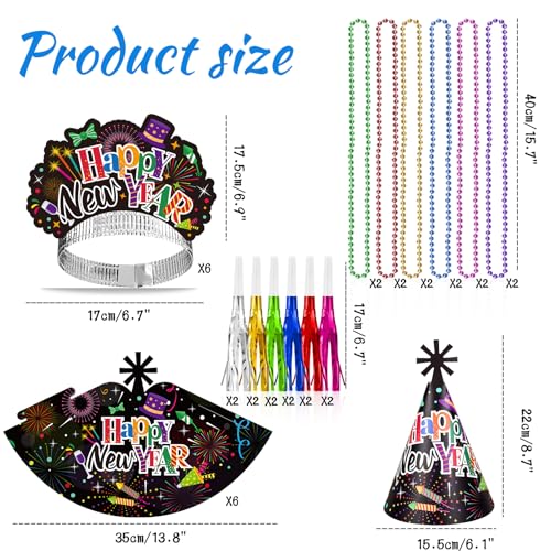 【2025 New Year Party Supplies set】 You will receive 54 New Year Party Supplies, which include 6 Cone hats, 6 Happy New Year headbands, 12 strings of plastic pearl chains, 18 pcs Happy New Year party and 12pcs Happy New Year Blowouts. This New Year prop set can be used for multi-person gatherings, and you can spend a happy New Year time with your family and friends.