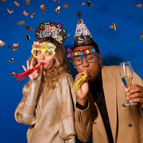 【Quality Material】HAPPY NEW YEAR Hair Clasp Headband are premium plastic materials, new year party squawkers made of quality plastic and paper, new year eve party glasses and new year eve party paper hats made of quality cardstock! This New Years Eve Party Supplies 2025 are safe and no smell, light weight, provide you comfortable new year party experience!