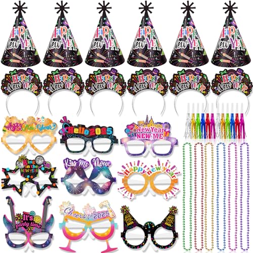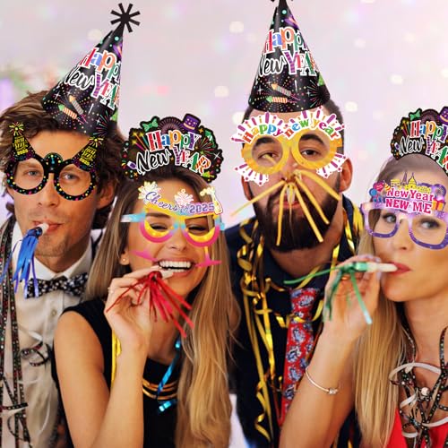 Specification: HOWAF Happy New Year Eve Party Supplies Set, 54 Pieces New Year 2026 Eyeglasses Cone Hats Headband Fringed Noisemaker and Necklace, Black and Colorful New Year’s Eve Party Decorations